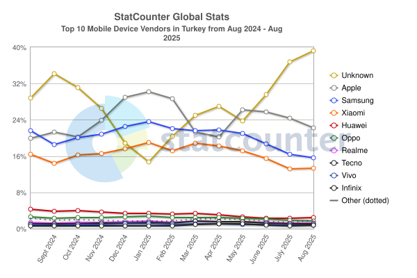 Akıllı telefon pazarındaki rekabet hız kesmeden sürerken, Statcounter’ın Ağustos 2025 verileri Türkiye ve dünya genelinde en çok kullanılan telefon markalarını ortaya koydu. Türkiye’de ise dikkat çeken bir detay öne çıktı: Kayıt dışı/kaçak telefonlar (Unknown) listenin zirvesine yerleşti.